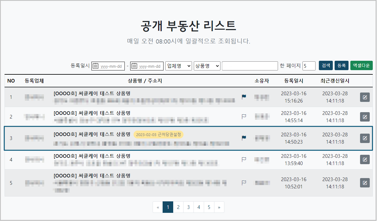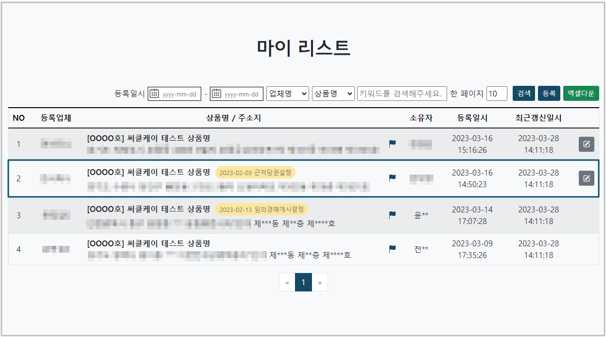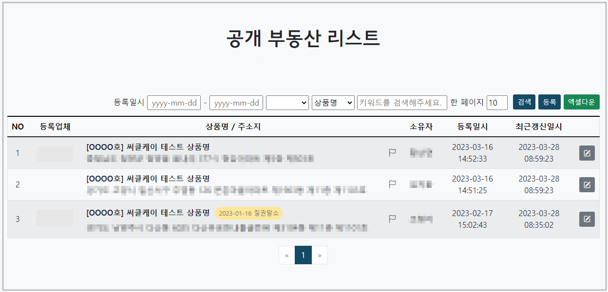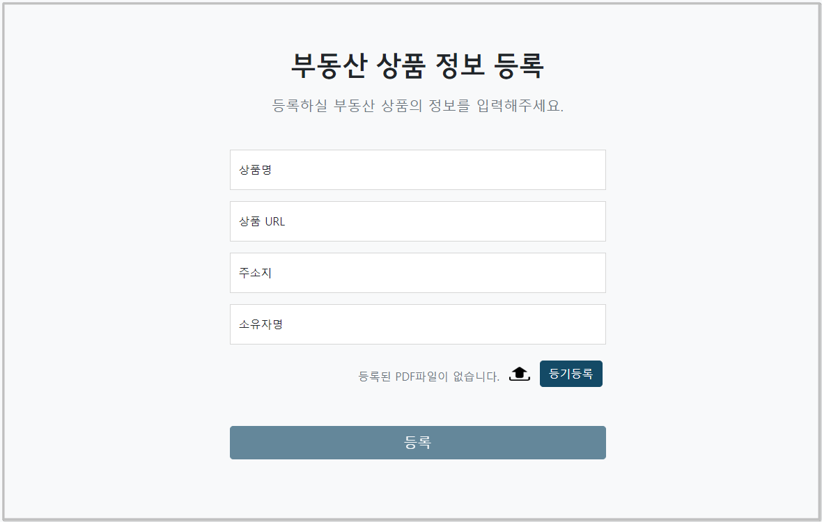 부동산 상품 정보 등록 창에 상품명, 상품 URL, 주소지, 소유자명을 입력을 하고, 등록을 하시면 공개 부동산 리스트에 등록이 됩니다.